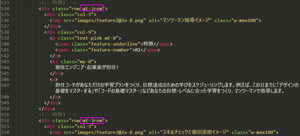 上図のように各div.rowの間隔が広すぎるので、mt-5remクラスを変更しましょう。