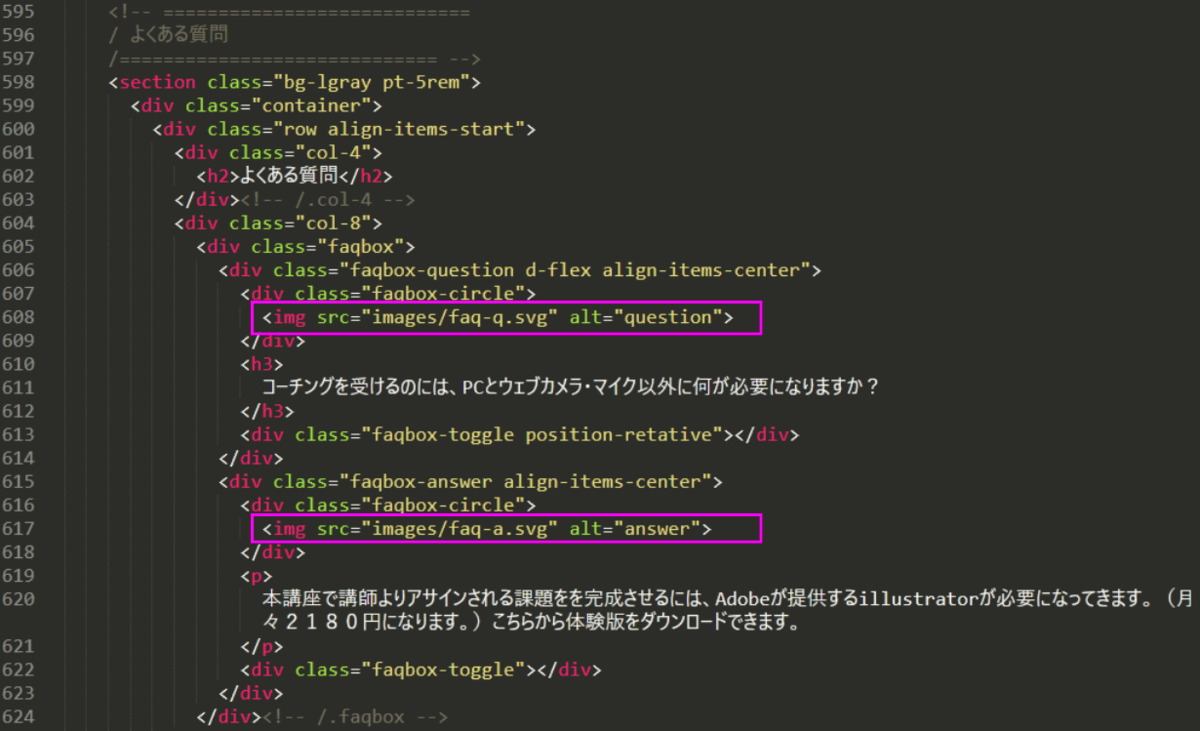 .faqbox-circle内に画像(faq-q.svg、faq-a.svg)をそれぞれ挿入。