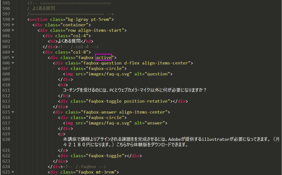 開いている状態にするため、faqboxクラスと並べてactiveクラスを追加。