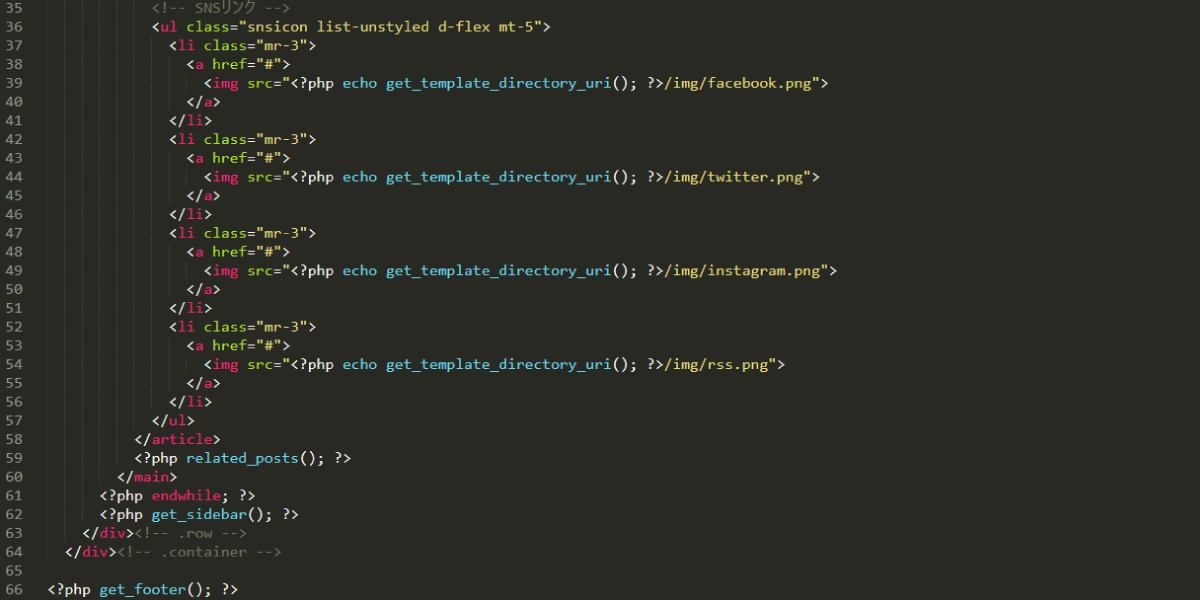 前回index.phpの投稿記事本文出力まで終わりました。 今回はその下、SNSリンクと関連記事を作っていきましょう。