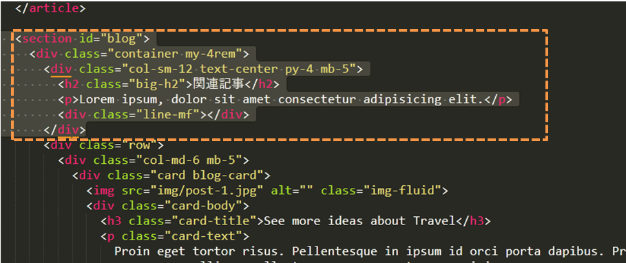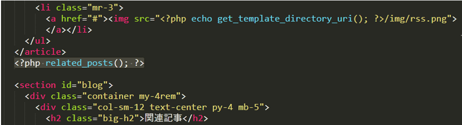 single.phpのblogセクション開始タグ~見出しを囲っているdivの閉じタグまでをコピー。 yarpp-template-myportfolio.phpのH3タグ部分と置き換えます。