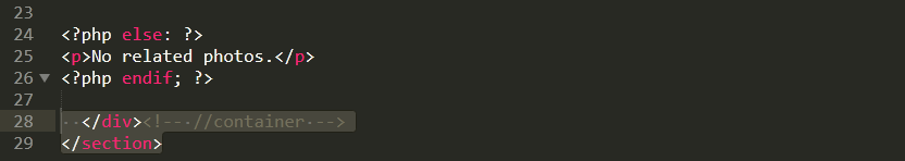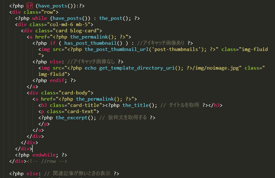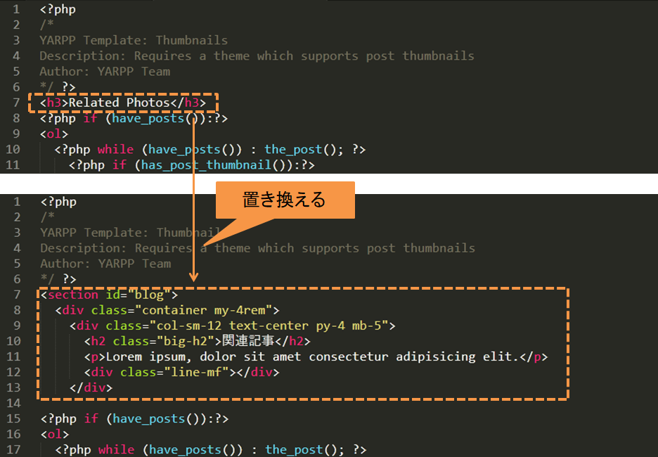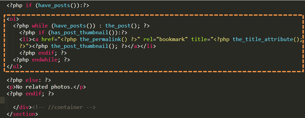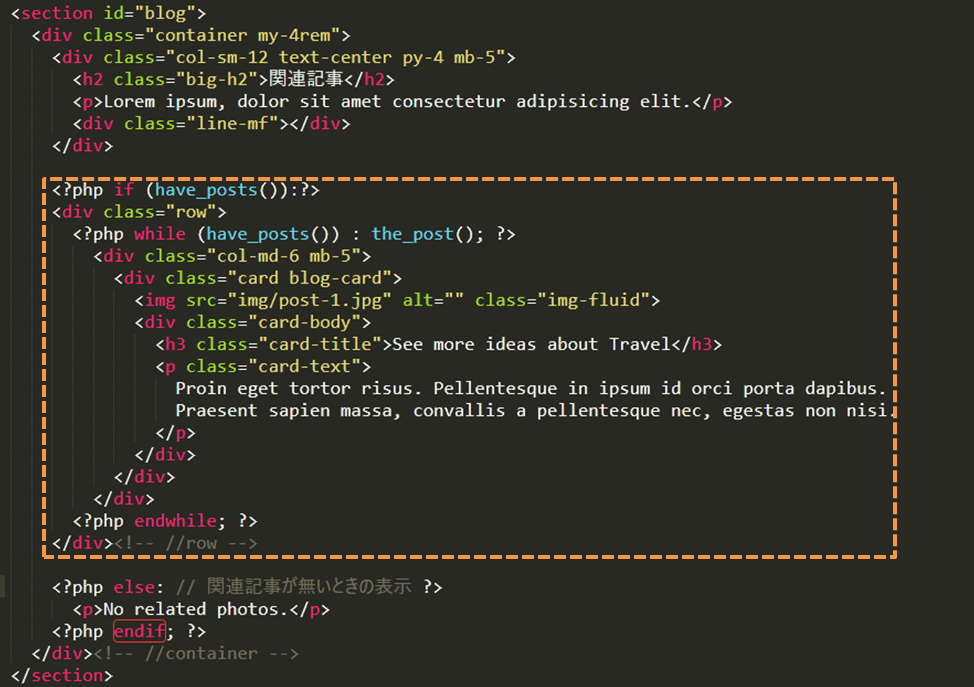 次にループ内を変更していきます。 関連記事が無かったら「No related photos.」を表示するという条件分岐が既に出来ていますので、変更するのはオレンジの点線箇所内です。