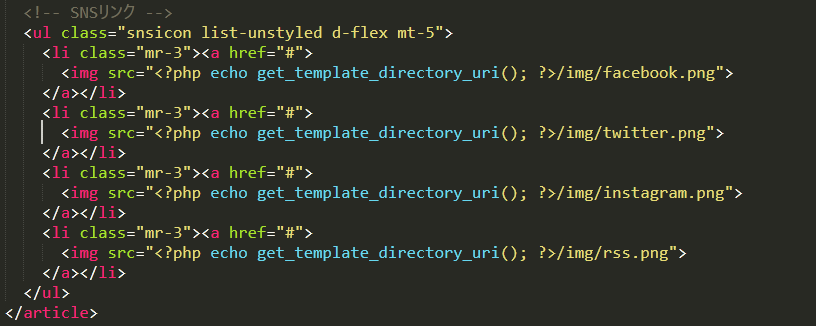 今回作成したSNSリンク以下の部分は、下記のような形になりました。 (※htmlファイルの組み方によって若干変わる場合もあります)