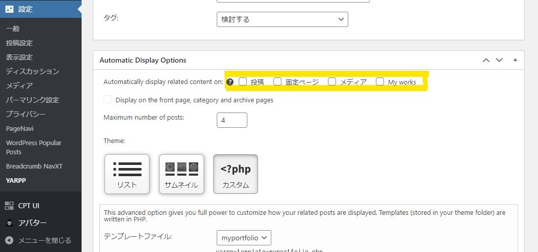 管理画面、YARPPの編集画面をリロードしてください。 テーマを選ぶところでカスタムをクリックすると、プルダウンの選択肢が表示されます。